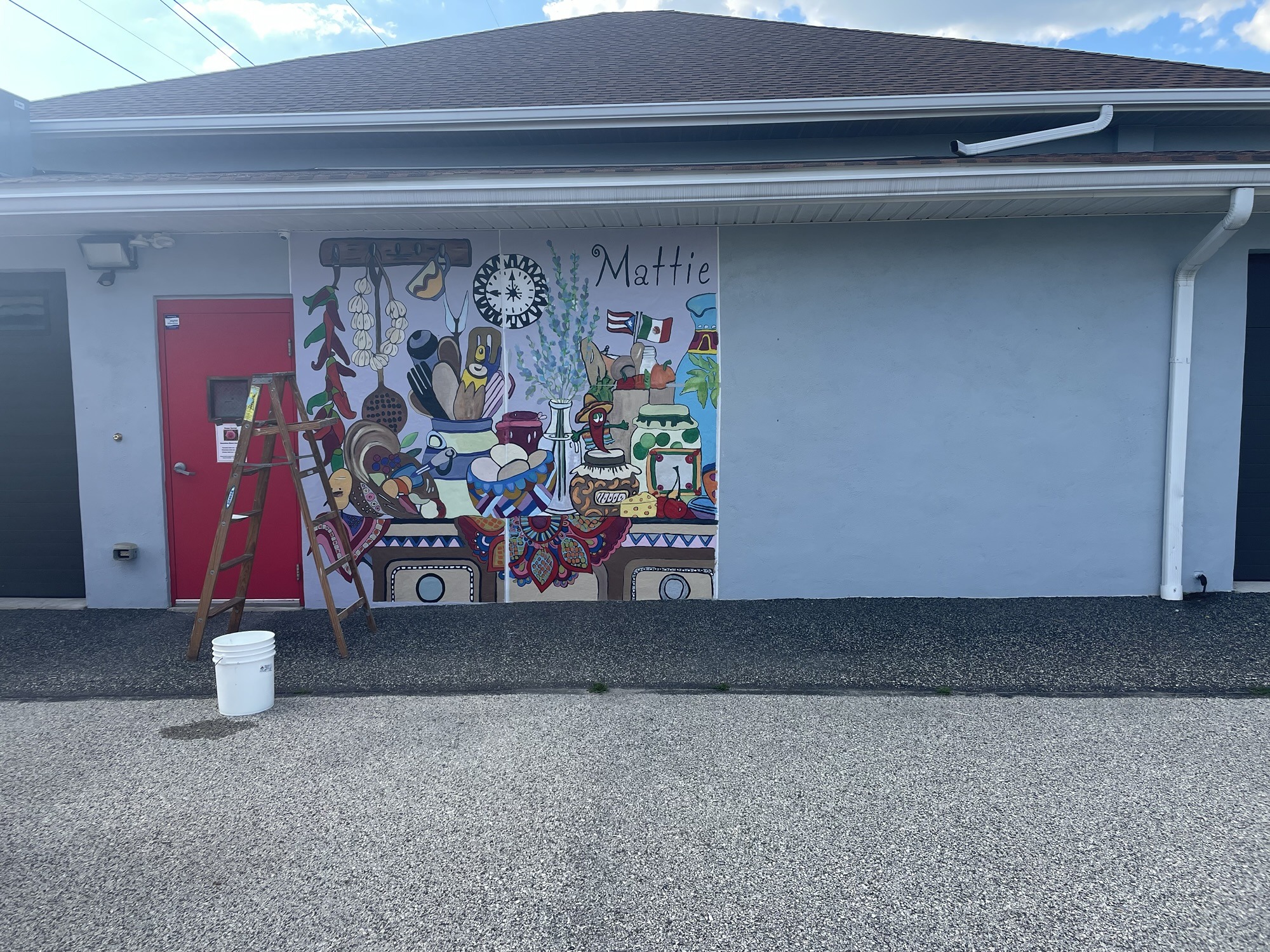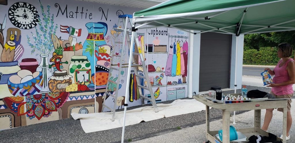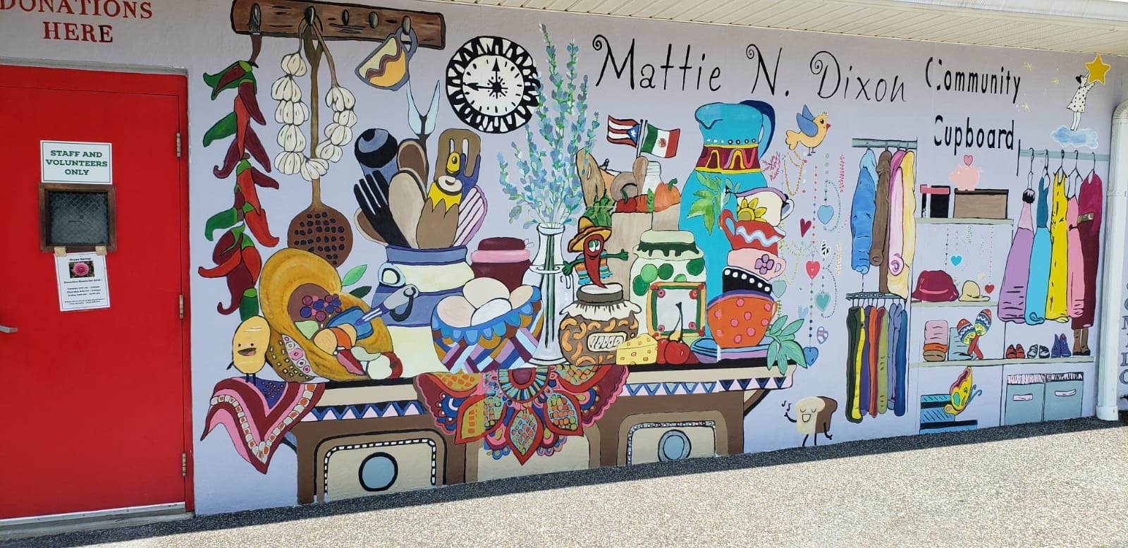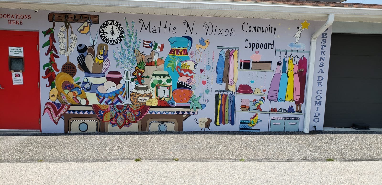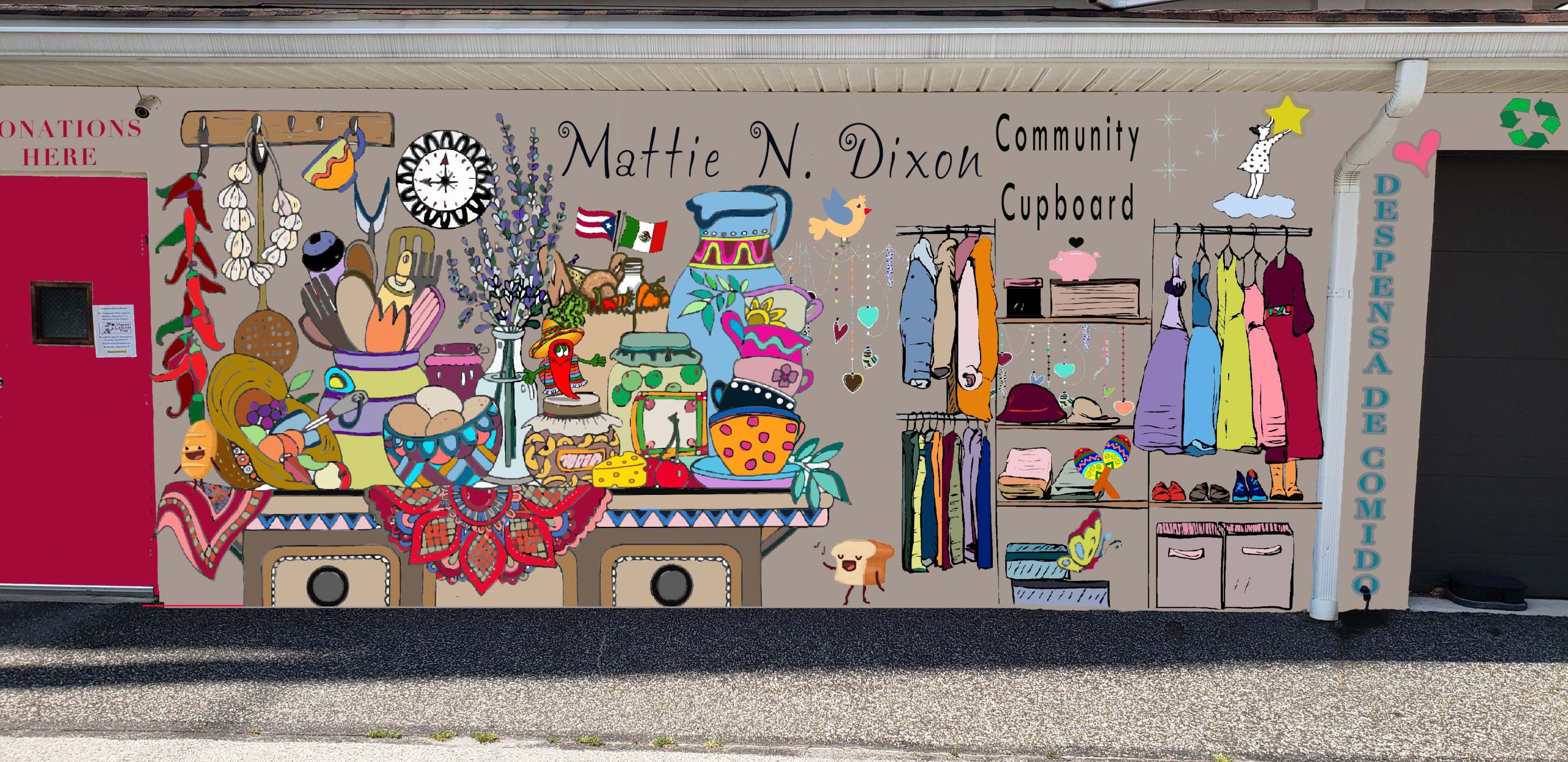 Located on Main Street in Ambler, PA, the mural reflects themes of care, nourishment, and shared resources—drawing on imagery of kitchens, clothing, and everyday life to represent the spirit of the community cupboard.