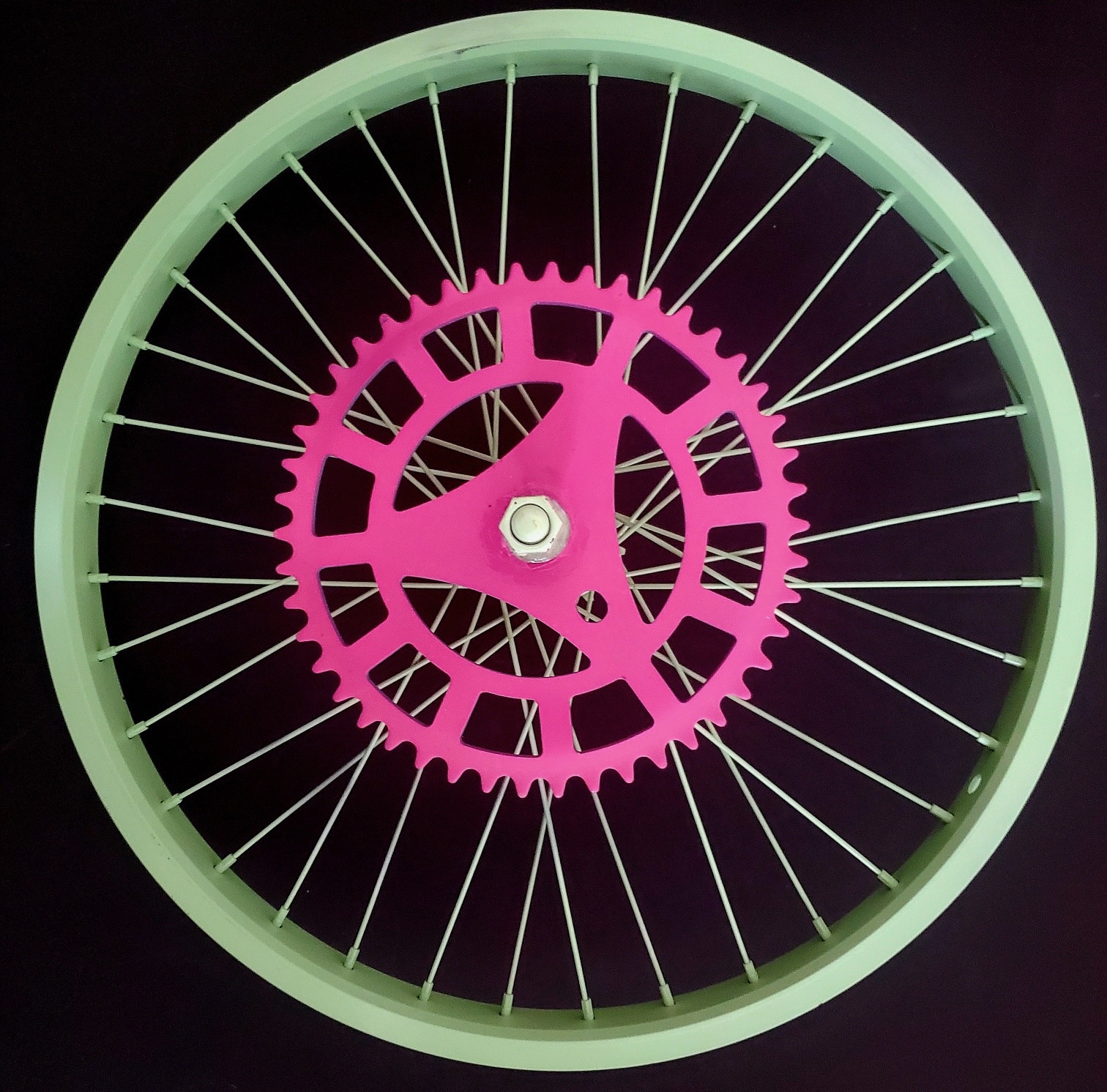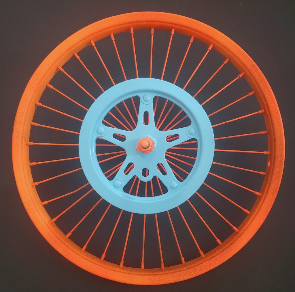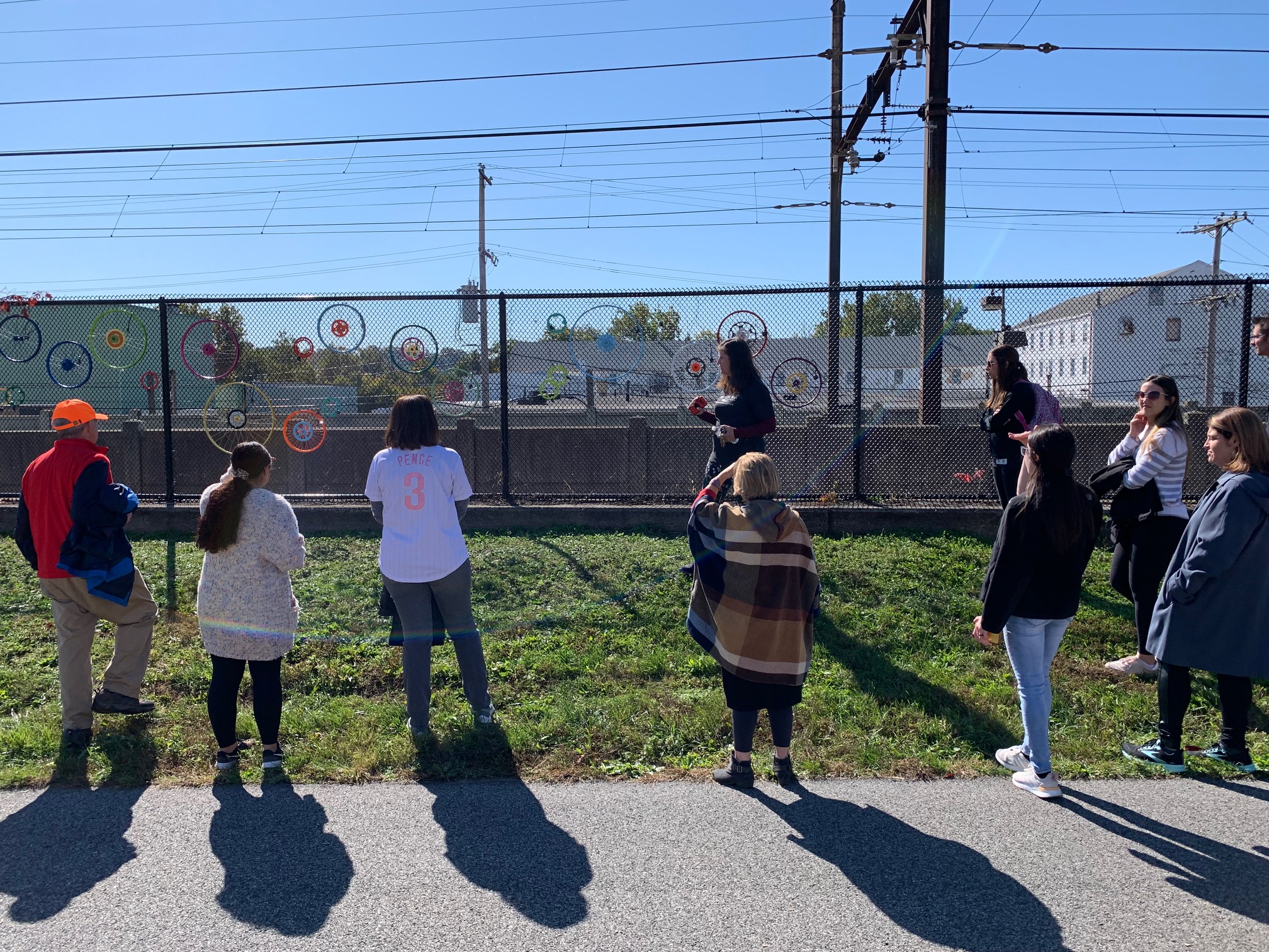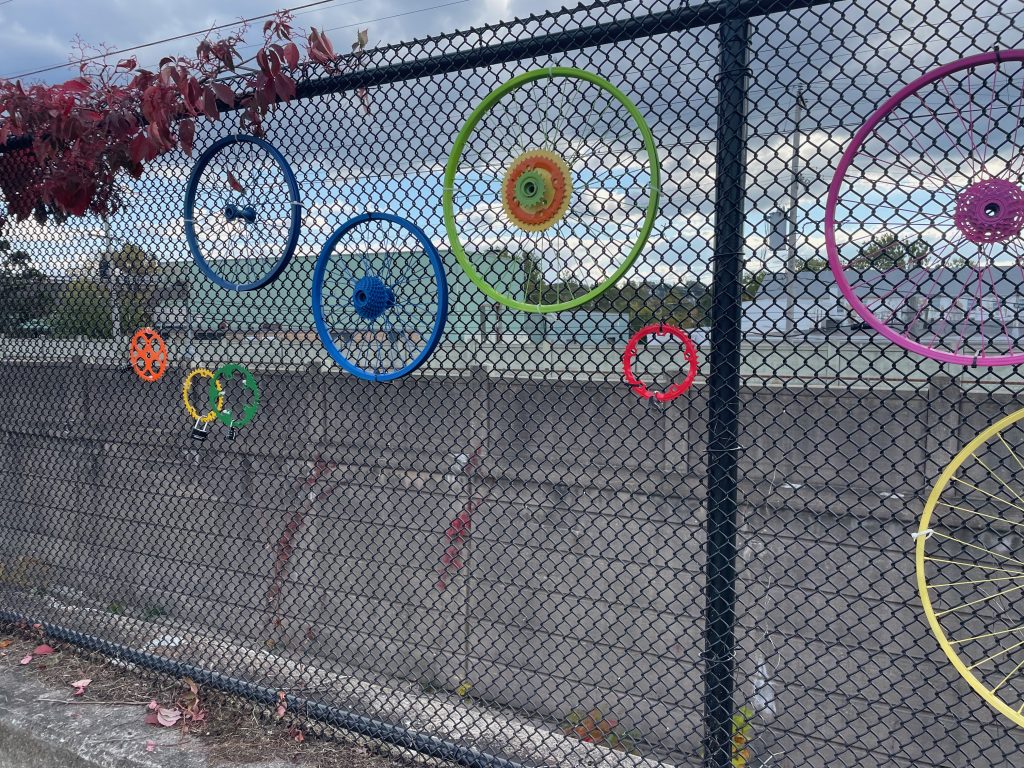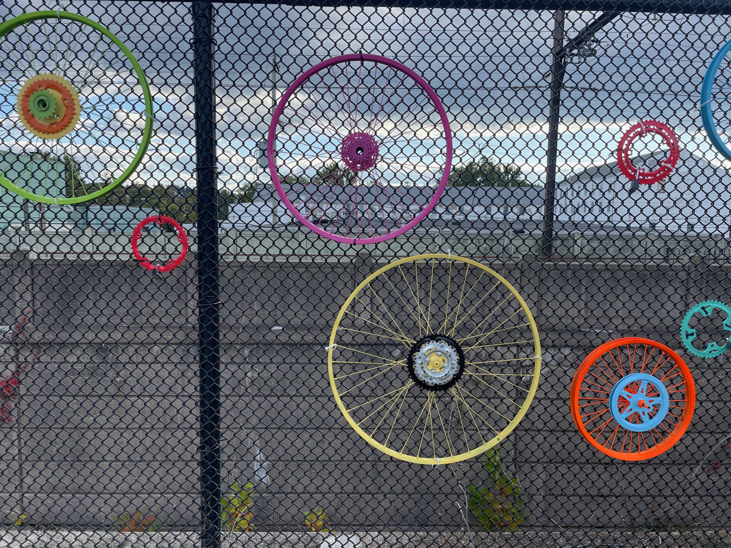 In addition to the bridge mural, the project included colorful bike wheel sculptures and stepping stones created in collaboration with Expressive Path. Installed along the fence line near the trail, the wheel pieces extended the movement-inspired theme beyond the bridge and added bright, playful visual markers for people walking, biking, and passing through the area.