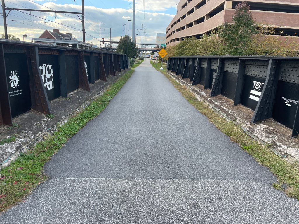Brush With the Law collaborated with Expressive Path on a public art project along the Schuylkill River Trail near the Norristown SEPTA station. The project combined bike-inspired bridge imagery, colorful wheel sculptures, and stepping stones to celebrate movement, trail use, and community connection along this busy Montgomery County pathway.