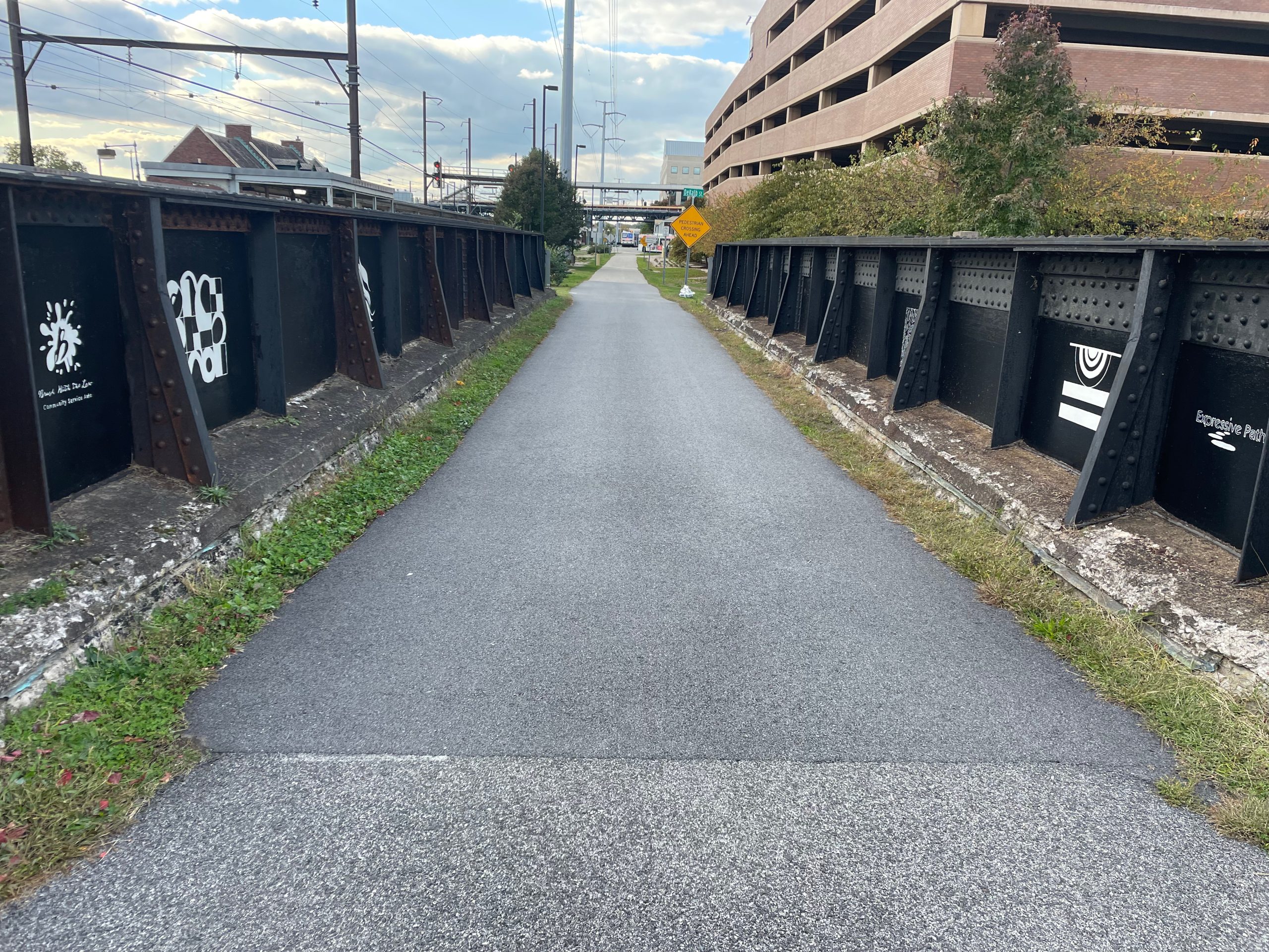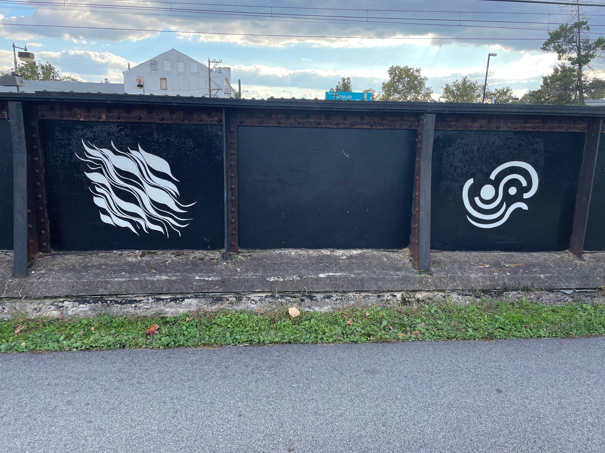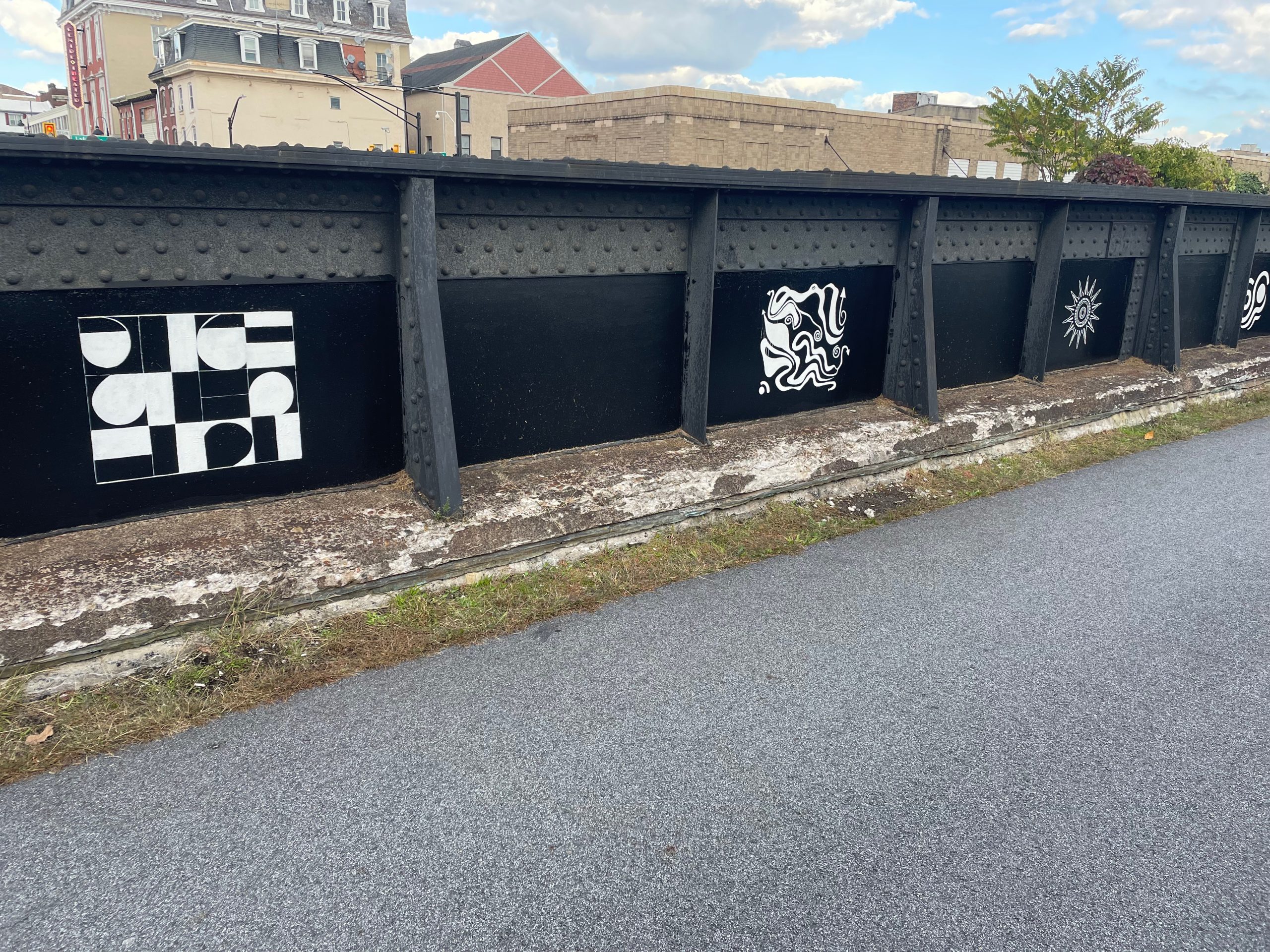 For the bridge mural, artist Maria Maneos designed bold black-and-white symbols inspired by bicycles, bike parts, riding, motion, and the visual rhythm of the trail. The imagery was created to bring energy to the bridge while connecting the artwork directly to the experience of moving through the space by bike or on foot.